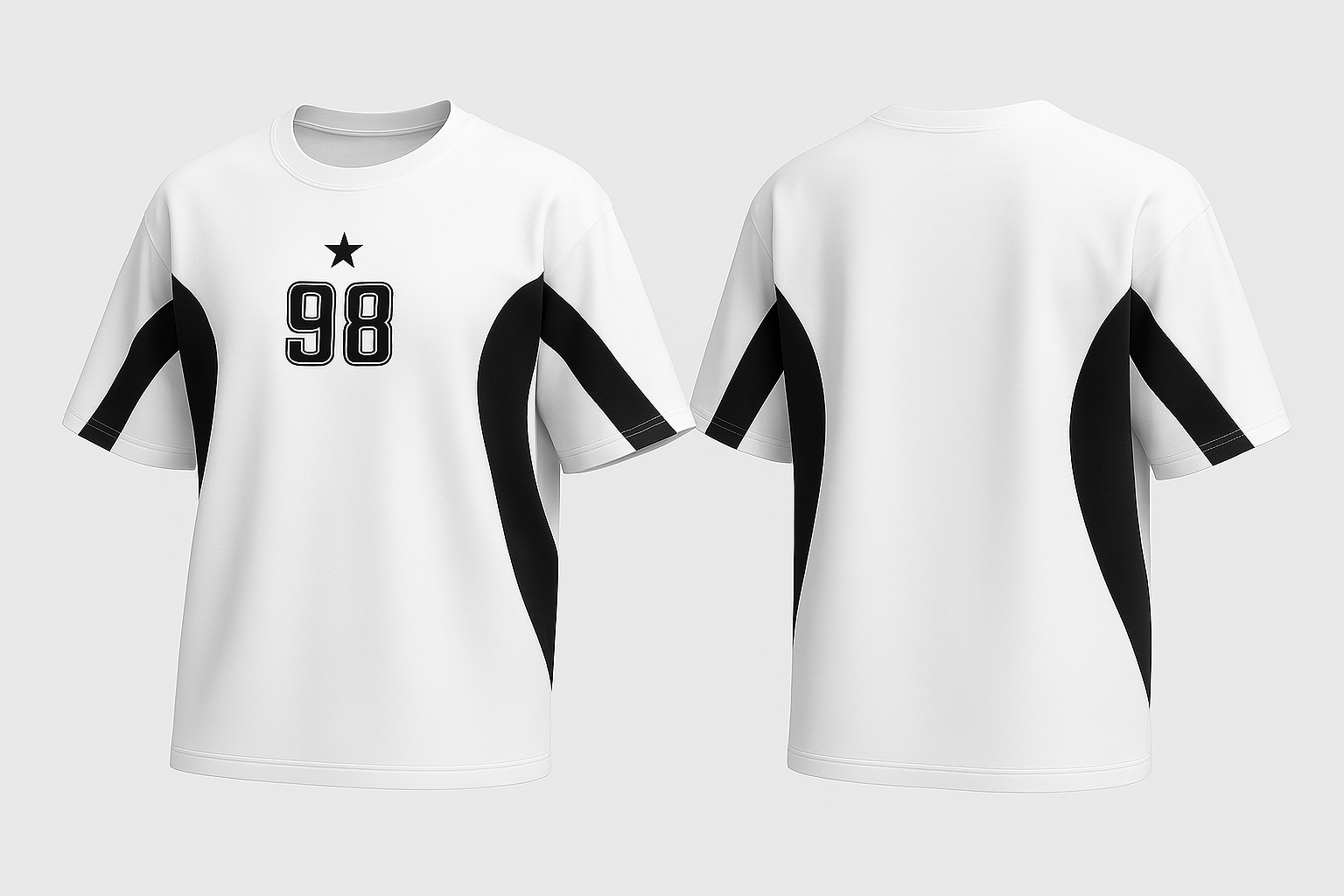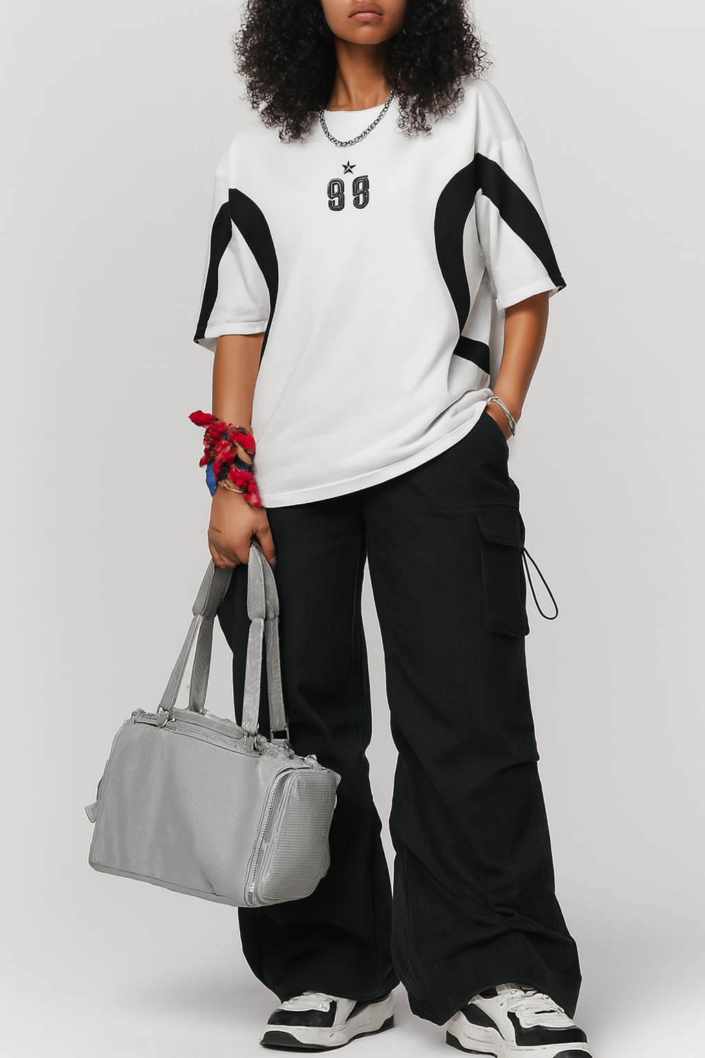 tep into the spotlight with Shadowline '98, a statement tee that blends street-luxe attitude with minimalist precision. Crafted from cotton, it delivers breathable comfort with a heavyweight feel—made to move with you from day to night. Sculpted black curve panels and a crisp white base create a silhouette that’s bold, clean, and unapologetically you. The front “98” graphic nods to legacy and rebellion—because you weren’t born to blend in.